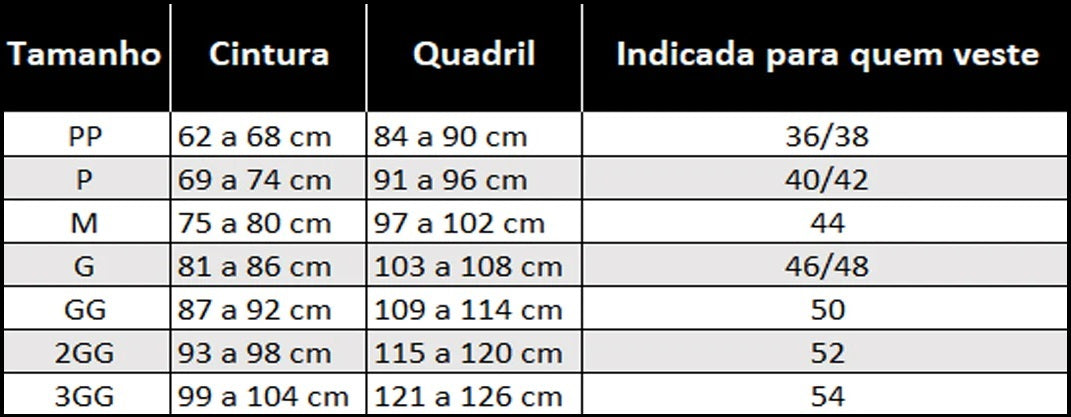 Nossas peças podem ter medidas diferentes daquelas que você está habituado a comprar. Para garantir o melhor ajuste, recomendamos que siga rigorosamente nossa tabela de medidas antes de selecionar o tamanho desejado.